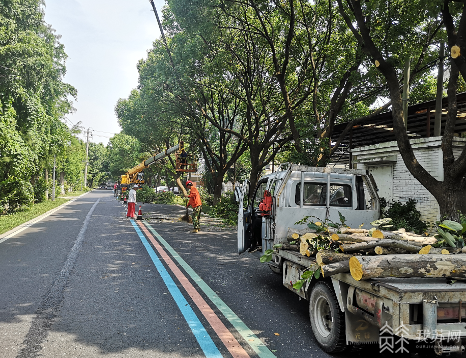 绿化作业人员根据要求实施作业,通过“疏枝”、“短截”等方法,对树枝进行合理修剪,清除存在安全隐患的枝条,减少行道树生长过密对交通安全的影响,并重点针对部分树木枝干过高、过大、过密,导致采光不足、通风不畅的问题枝干进行适当修剪,改善树冠内部的通风透光条件,使得树木看起来整体美观协调,预防病虫害的发生。同时,养护队安排人员负责运送树枝、清理路面,做到工完场清,确保施工安全。