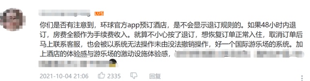 还有网友吐槽称:“(在)环球官方APP预订酒店,是不会显示退订规则的。如果48小时内退订,房费全额作为手续费收入。就算不小心按了退订,想恢复订单正常入住,取消订单后马上联系客服,也会被以系统无法操作为由没法撤销操作。”