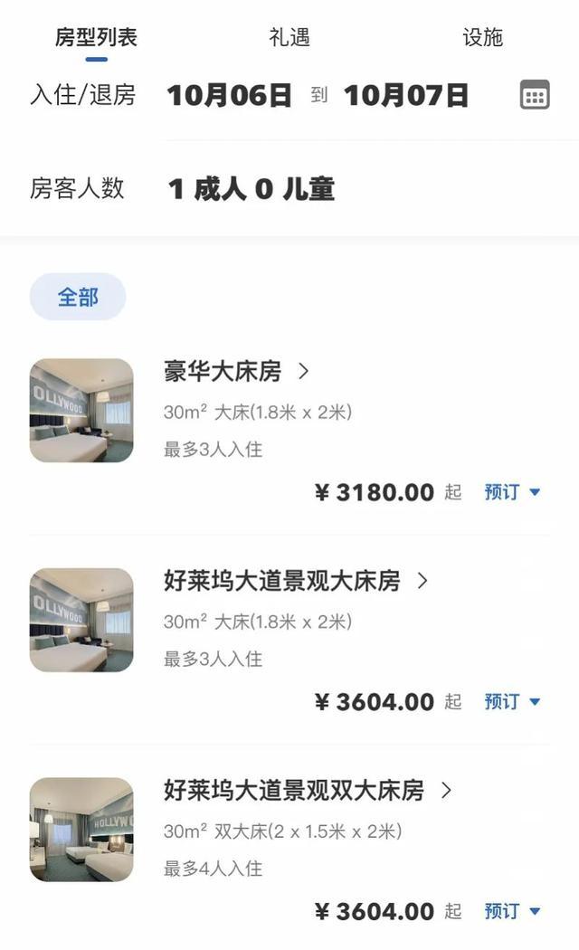 园区官方平台所显示的环球影城大酒店部分可订房型及价格。