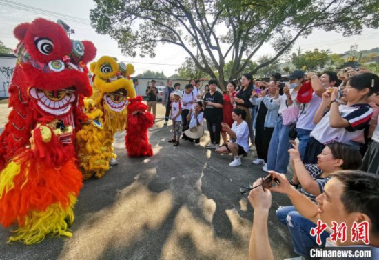 而在嵊州市沙园村,当地多支志愿者队伍与村民一起舞龙舞狮、载歌载舞,体验传统的乡村运动。现场,志愿者们还体验打稻谷、拉独轮车等传统农活。