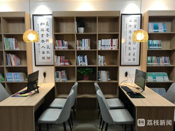 书房内,外观高雅独特的吊灯洒下一丝温暖,宽敞的书桌上摆放着温馨的绿植,给人一种愉悦的享受。书房被巧妙地分隔成两间,落地的书架上摆着文学名著、童话、散文等各种经典书籍。这里设施齐全,配有电脑、电视等,既可供没有电脑的孩子查阅资料,也方便在这里开展公益讲座。