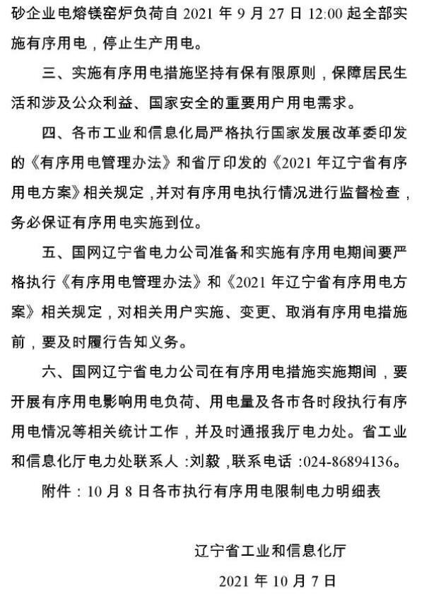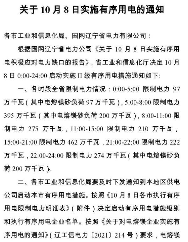 荔枝新闻讯 据辽宁省工信厅预警通报,根据电力供需平衡预测,10月8日辽宁省最大电力缺口为462万千瓦。依据国家发改委《有序用电管理办法》,为严重缺电II级橙色预警,决定10月8日0:00—5:00限制电力97万千瓦,5:00—8:00限制电力395万千瓦,8:00—11:00限制电力275万千瓦,11:00—15:00限制电力210万千瓦,15:00—21:00限制电力462万千瓦,21:00—22:00限制电力222万千瓦,22:00—24:00限制电力274万千瓦。