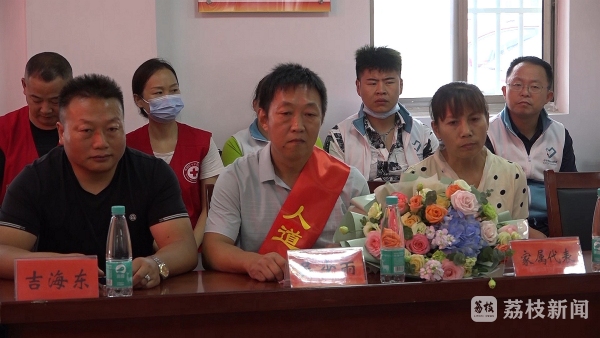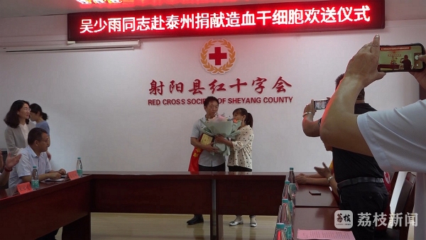 在欢送会上,射阳县红十字会负责人给吴少雨医生披上绶带,并颁发“爱心大使”牌匾。据了解,欢送会结束后,吴少雨医生在其家属和红十字会工作人员的陪同下,于10月9日下午3点前入住泰州的医院,为捐献造血干细胞做准备。