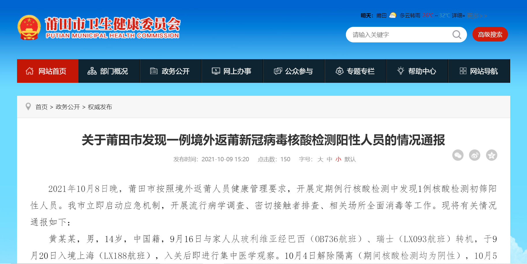 黄某某,男,14岁,中国籍,9月16日与家人从玻利维亚经巴西(OB736航班)、瑞士(LX093航班)转机,于9月20日入境上海(LX188航班),入关后即进行集中医学观察。10月4日解除隔离(期间核酸检测均为阴性),10月5日乘动车(D3107次13车14F座位)入莆,由专车“点对点”接送至集中隔离点进行集中医学观察,入住后10月6日核酸为阴性。10月8日晚核酸初筛阳性,后经实验室复核为阳性。目前,黄某某由定点医院进行隔离救治,情况平稳。经排查,黄某某在莆密接人员6人(为其一同回国家属及动车同车厢人员),已落实隔离医学观察措施,涉及场所均已开展终末消毒。