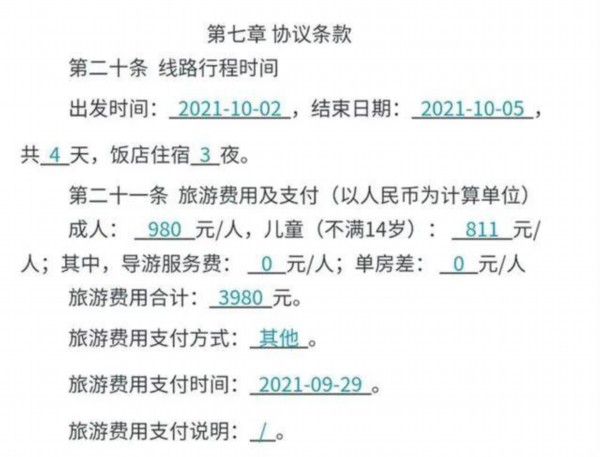 根据旅游合同显示,这次旅程共计4天3夜,单个成人的费用是980元。考虑到是省内出游,且在十一黄金周前已订好房间和行程,从收费来看已经不能算是“低价游”,旅行社显然不应在履约上打折扣,导致游客连最基本的旅行目的都无法实现。