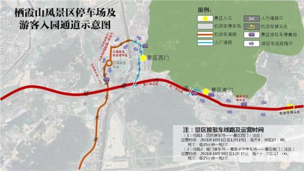 因栖霞山外部片区正在升级改造,从停车场到景区路程稍远,今年景区特意设置了接驳车辆,从外部停车场直接接至景区西门与南门附近,接驳时间为 8:30 — 17:00,约 15 分钟一班。