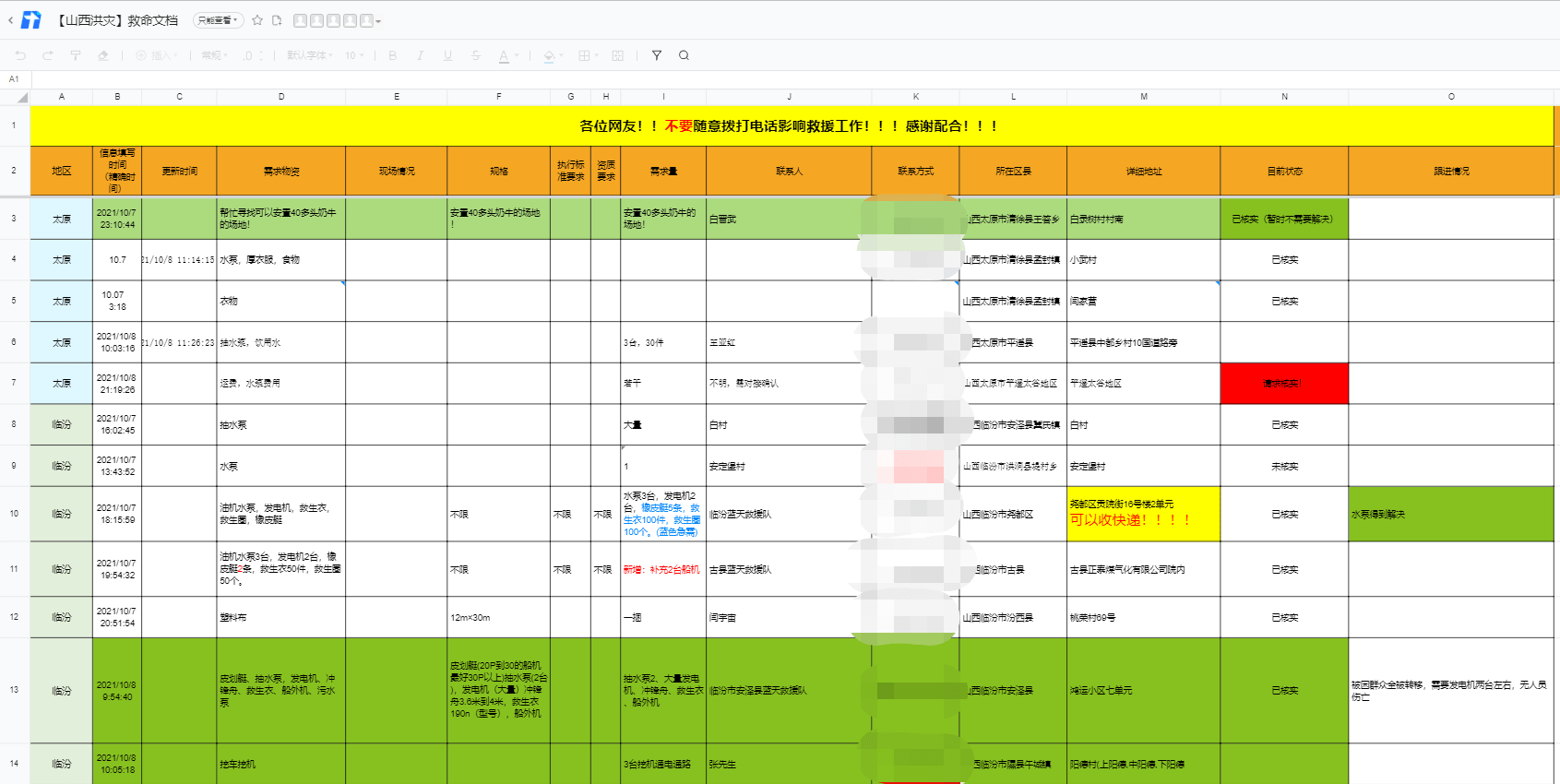 需要抽水泵、皮划艇、棉被棉衣……与此同时,一份名为“山西洪灾救命文档”的在线表格在网络上渐渐流传,其中分地区详细记载着众多地区在暴雨洪灾中的求助信息,包括需求物资、需求量、联系人、联系方式、所在区县、目前状态等十几个小项。