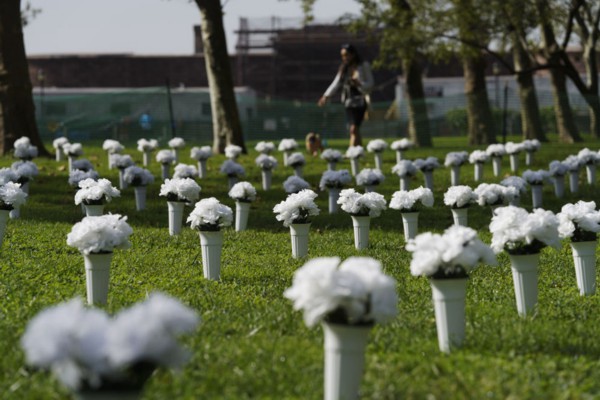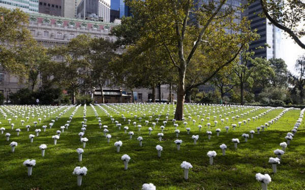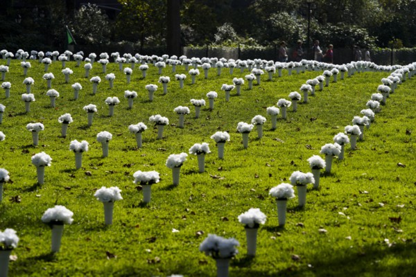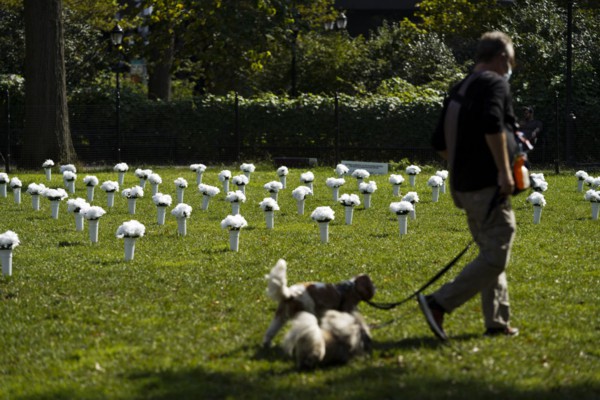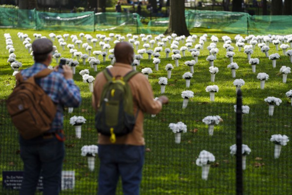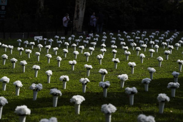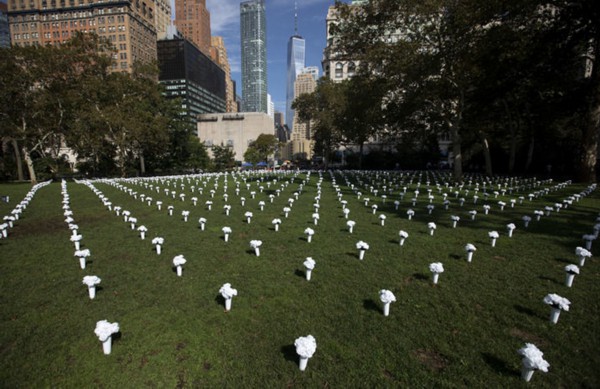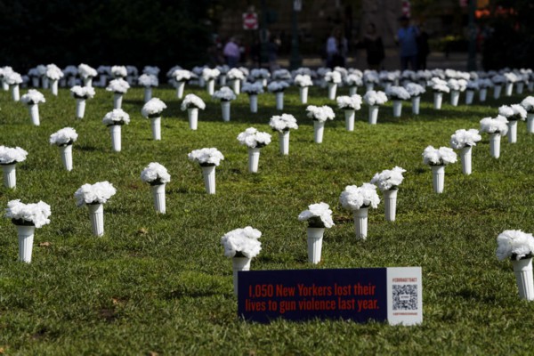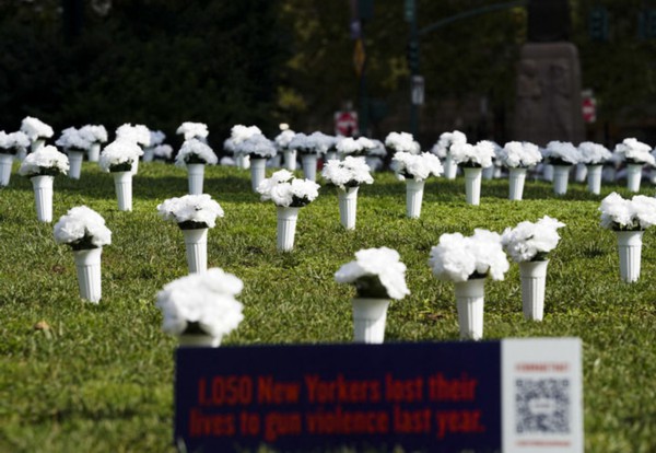 10月8日,在美国纽约炮台公园,1050个白色瓶花组成大型纪念装置,悼念2020年在纽约州死于枪支暴力的1050名受害者,呼吁政府针对枪支暴力采取行动。
