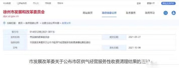 10月9日,徐州市发展和改革委员会官网发布最新消息《市发展改革委关于公布市区供气经营服务性收费清理结果的通知》。其中,明确规定市区民用燃气工程安装费不得另行向用户收费;此外,补办燃气交费卡(证)工本费、燃气复供费两项费用取消收费。