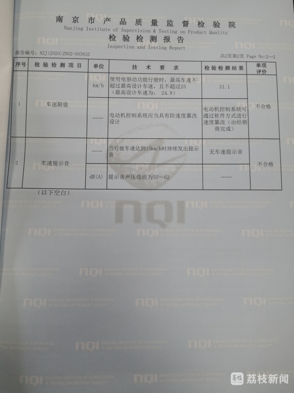 公证人员购买的车辆,经南京市质检院检测,被判定为不合格,车辆限速和车辆提示音均不合规。因此,南京市市场监管局联合公安部门对涉事销售门店和仓库进行了查处。为了进一步取证,南京市市场监管局邀请技术专家对查封的车辆进行了认定。南京市市场监管局稽查局副局长徐勐告诉记者:“有些厂家存在送检样品的时候,他送的是符合国标的车型,但是取得了认证的许可证之后,在实际投入生产和销往市场的时候,把车型做了改变,也就是我们通俗的讲两张皮的现象,他真正到市场上的车,已经不是获得认证的时候车的原样了。”