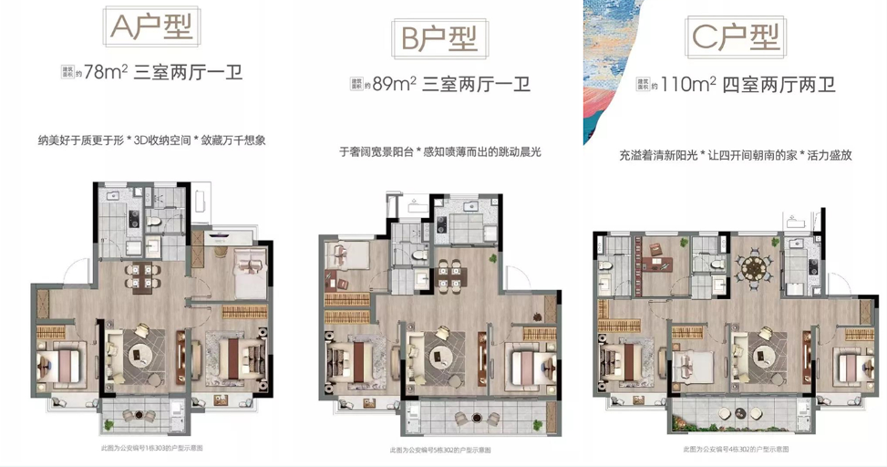 项目定位打造滨湖洋房,户型建面约78-110㎡,一梯两户,得房率达82%。