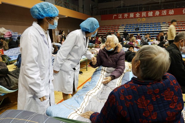 10月8日,在运城市新绛县体育馆安置点,两名值守医护人员(左)了解洪峰受灾群众身体健康情况。高新生摄