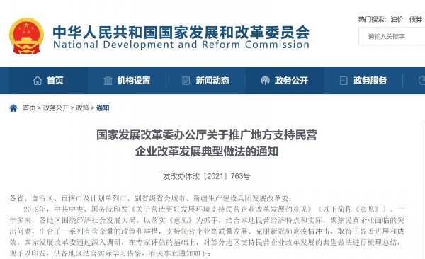 发改委称,2019年,中共中央、国务院印发《关于营造更好发展环境支持民营企业改革发展的意见》(以下简称《意见》)。一年多来,各地区围绕经济社会发展大局,以落实《意见》为抓手,结合本地民营经济特点和实际,聚焦民营企业面临的突出问题,出台了一系列有含金量的政策和举措,支持民营企业高质量发展、克服新冠肺炎疫情冲击,取得了显著进展和成效。国家发展改革委通过深入调研,在专家评估的基础上,对部分地区支持民营企业改革发展的典型做法进行梳理总结,现予以印发,供各地区结合实际学习借鉴。