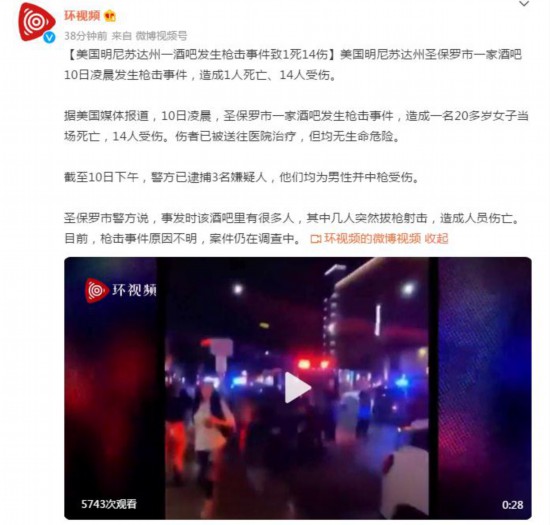 美国明尼苏达州圣保罗市一家酒吧10日凌晨发生枪击事件,造成1人死亡、14人受伤。