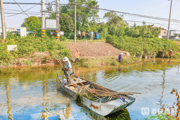 图为水利局工作人员正在三圩港巡河现场查看水草清除情况。