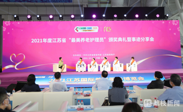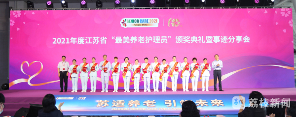 在2021年度江苏省"最美养老护理员"颁奖典礼现场,来自江苏各地的100名基层护理员受到表彰,5名养老护理员代表现场分享了自己的从业经历和感人故事。他们在平凡岗位上,用爱坚守、用心呵护,为老人托起希望。