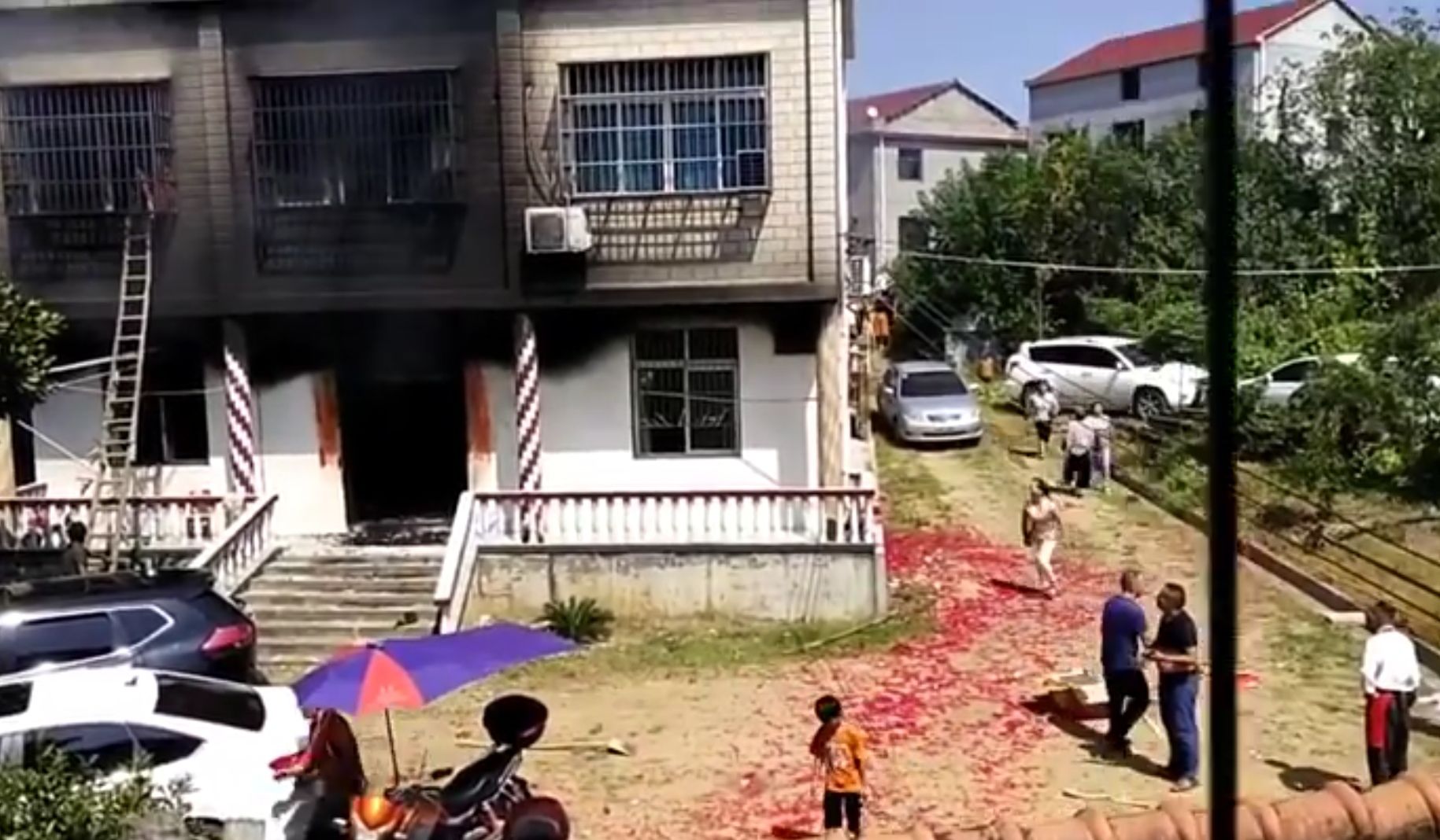 另有一段时长7秒的现场视频显示,事发地二楼两扇窗户被熏黑,里面仍有烟冒出,一楼大厅内有一浑身黢黑的人走出,似乎受此事故波及。村民证实,该二层小楼即为陈某言家。