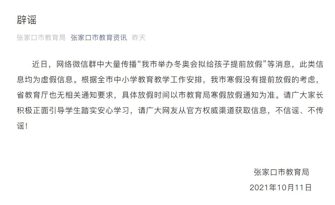 荔枝新闻讯 河北张家口市教育局微信公众号“张家口市教育资讯”10月11日发布辟谣信息称,近日,网络微信群中大量传播“张家口市举办冬奥会拟给孩子提前放假”等消息,此类信息均为虚假信息。根据全市中小学教育教学工作安排,张家口市寒假没有提前放假的考虑,省教育厅也无相关通知要求,具体放假时间以市教育局寒假放假通知为准。