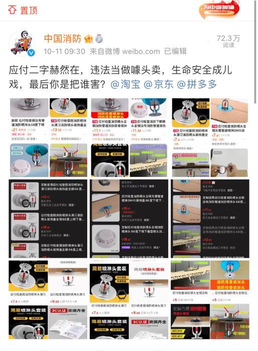 “应付二字赫然在,违法当做噱头卖,生命安全成儿戏,最后你是把谁害?”11日,中国消防微博点名批评几大网购平台上多家店铺售卖名为“应付检查假消防喷淋头”的物品。