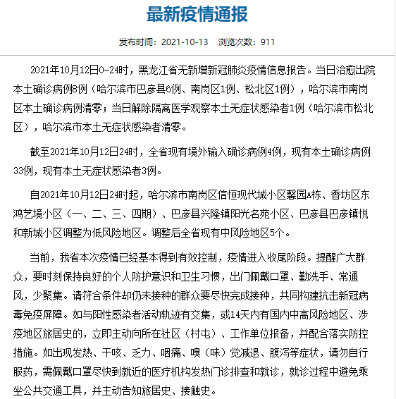 自2021年10月12日24时起,哈尔滨市南岗区信恒现代城小区馨园A栋、香坊区东鸿艺境小区(一、二、三、四期)、巴彦县兴隆镇阳光名苑小区、巴彦县巴彦镇悦和新城小区调整为低风险地区。调整后全省现有中风险地区5个。