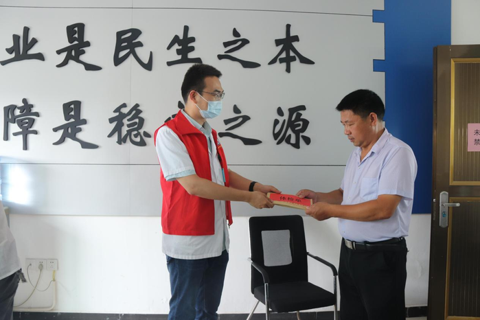 医生二支部组织委员李国栋将困难群众体检卡交到东湾村支部书记手中,请他代为发放。