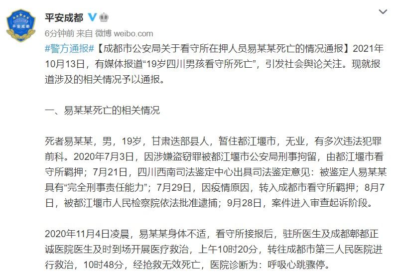 荔枝新闻讯 据“成都公安”10月14日消息,10月13日,有媒体报道“19岁四川男孩看守所死亡”,引发社会舆论关注。现就报道涉及的相关情况予以通报。