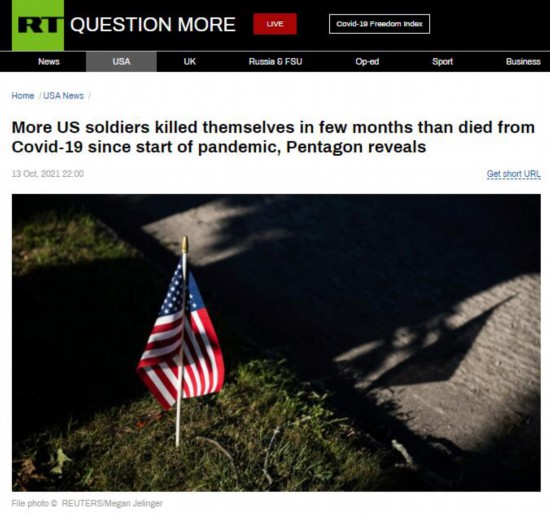 据“今日俄罗斯”(RT)13日报道,根据美国五角大楼一份最新报告,仅在今年第二季度,美军之中自杀人数就已超过因新冠而死亡的人数。