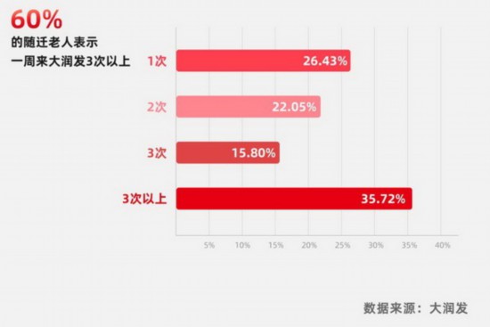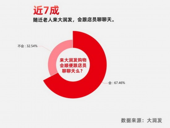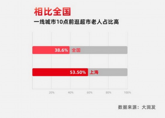 重阳节之际,大润发发布《“老漂族”逛超市报告》,报告显示:早上10点前去逛超市的老年顾客占比,一线城市比全国高出15个百分点;60% 的受访者称一周会去逛大润发3次以上,近7成表示会和相熟的店员唠家常……