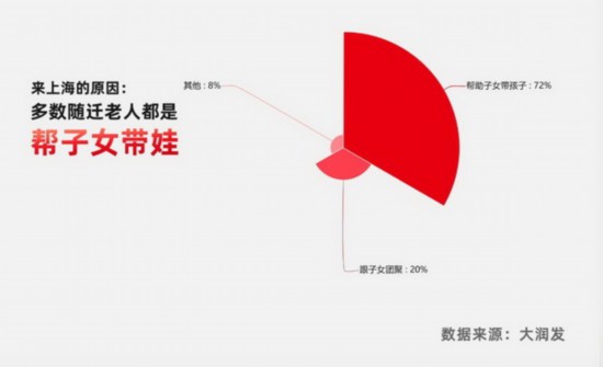 根据《中国流动人口发展报告2018》,专门为照顾晚辈到大城市的老人占比高达43%,且老年流动人口数据在持续增长。大润发此次的问卷调查也显示,72%的随迁老人来到上海,都是为了帮子女带娃。