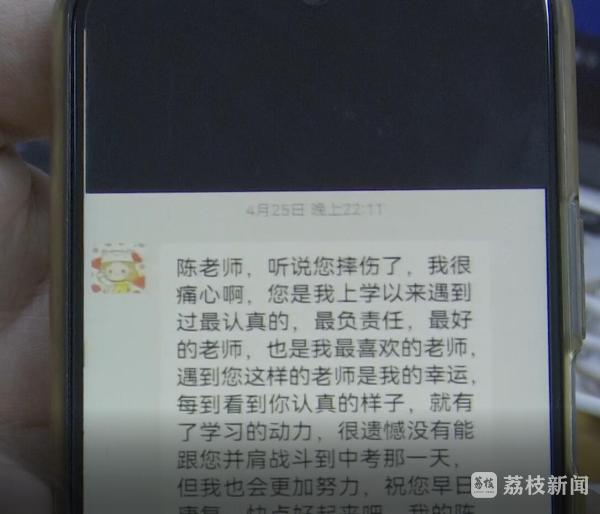 陈石说:“住院期间,疼在腿上,但心是甜的。因为很多的家长通过微信、电话鼓励我养好腿伤,孩子们也抽空到医院来看望我,这让我觉得应该尽早的走上工作岗位,走上讲台,走到他们的中间去。”