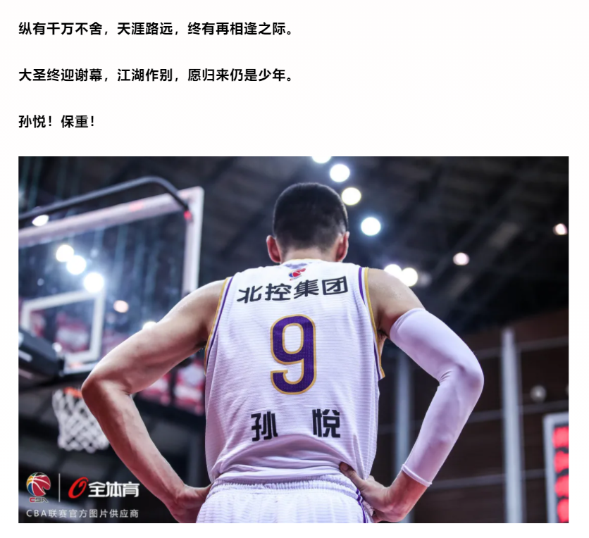 在孙悦耀眼的成绩背后,饱含着他对于篮球的热爱和执着。21年的职业生涯,至此终将落幕。作为大圣职业生涯的最后一站,彼此陪伴走过这弥足珍贵的两年,感谢孙悦为北控篮球做出的卓越贡献,这也是北控篮球和孙悦的美丽缘分!