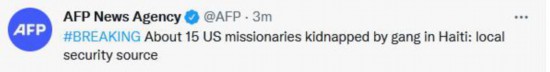 据法新社刚刚消息,大约15名美国传教士在海地被一伙人绑架。
