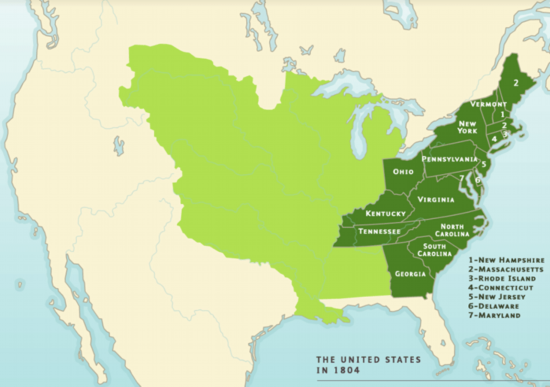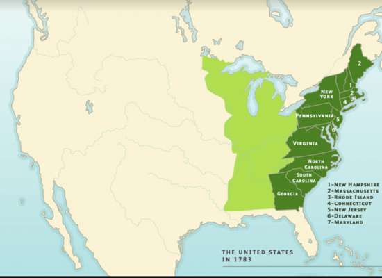 而后,在法国人的帮助下,美国人在导致数万人死亡的血腥独立战争中击败了英国人,正式完成建国,还在1783的英美巴黎合约中,迫使英国允许美国将版图进一步扩张到了密西西比河区域。至此,美国的版图从下图中原本深绿色的区域,拓展到了浅绿色的区域。