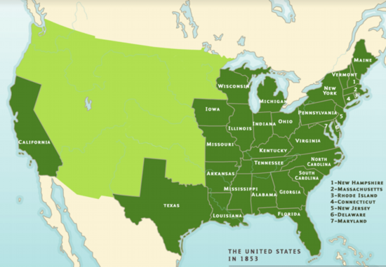 至此,到了1853年,美国的版图已经扩张到下图这种程度,非常接近如今美国本土的版图了。