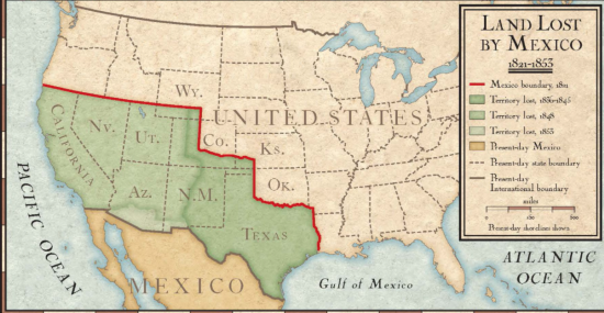其中最恶劣的案例,是美国于1846年到1848年间对刚从西班牙殖民者那里独立的墨西哥发动的掠夺战争。在这场导致两三万人死亡的残忍战争中,美国不仅吞并了原本属于墨西哥的得克萨斯,还抢走了该国的加利福尼亚等地。