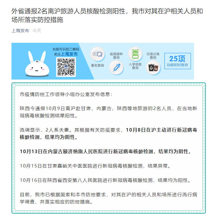 流调显示,2人系夫妻。其根据有关防疫要求,10月8日在沪主动进行新冠病毒核酸检测,结果均为阴性。