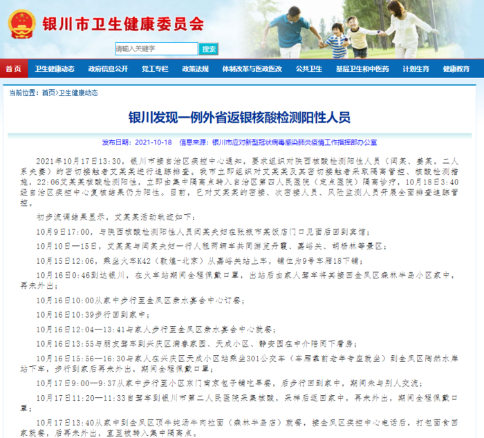 10月16日0:46到达银川,在火车站期间全程佩戴口罩,出站后由家人驾车将其接回金凤区森林半岛小区家中,再未外出;