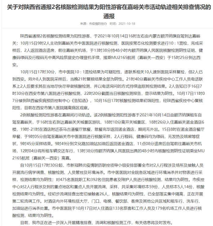 荔枝新闻讯 据嘉峪关市卫健委网站10月18日消息,嘉峪关市新冠肺炎疫情联防联控领导小组办公室18日凌晨发布通报,陕西省通报2名核酸检测结果为阳性游客,于2021年10月14日16时左右由内蒙古额济纳旗自驾到达嘉峪关;10月15日9时2人主动到嘉峪关市中医医院进行核酸检测,医院按常态化检测要求进行10∶1混检,完成采样后,2人返回酒店退房,前往嘉峪关机场,于13时38分持48小时内额济纳旗人民医院核酸检测阴性证明、健康码绿码及行程码无中高风险旅居史办理登机手续,搭乘MU2165航班(嘉峪关—西安)于15时25分到达西安。