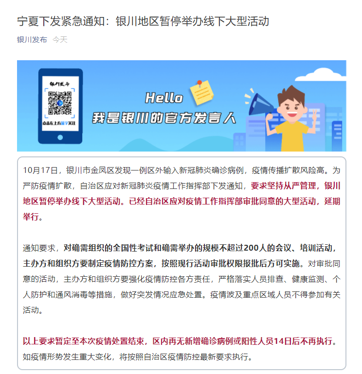 荔枝新闻讯 “银川发布”微信公众号10月18日消息,10月17日,银川市金凤区发现一例区外输入新冠肺炎确诊病例,疫情传播扩散风险高。为严防疫情扩散,自治区应对新冠肺炎疫情工作指挥部下发通知,要求坚持从严管理,银川地区暂停举办线下大型活动。已经自治区应对疫情工作指挥部审批同意的大型活动,延期举行。