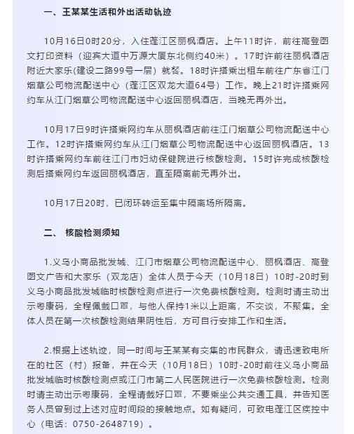 2.根据上述轨迹,同一时间与王某某有交集的市民群众,请迅速致电所在的社区(村)报备,并在今天(10月18日)10时-20时前往义乌小商品批发城临时核酸检测点或江门市第二人民医院进行一次免费核酸检测。检测时请主动出示粤康码,全程请戴好口罩,不要乘坐公共交通工具,并告知医务人员曾到过上述对应时间段的接触地点。如有疑问,可致电蓬江区疾控中心(电话:0750-2648719)。