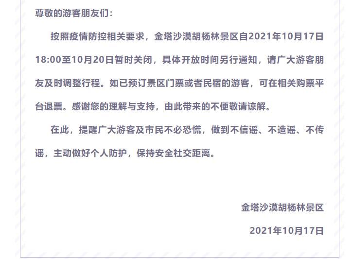 按照疫情防控相关要求,金塔沙漠胡杨林景区自2021年10月17日18:00至10月20日暂时关闭,具体开放时间另行通知,请广大游客朋友及时调整行程。如已预订景区门票或者民宿的游客,可在相关购票平台退票。感谢您的理解与支持,由此带来的不便敬请谅解。