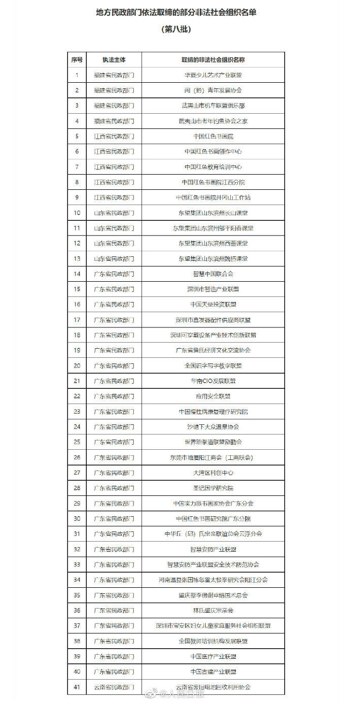记者18日从民政部了解到,民政部近日向社会公布第八批地方民政部门近年来依法取缔的部分非法社会组织名单,包括中国天使投资联盟等41家非法社会组织。社会公众如果发现名单中的非法社会组织仍在开展活动的,可依法向公安机关报案。