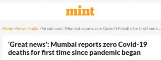 【环球网报道】“‘好消息’:自疫情暴发以来,孟买首次报告(单日)新冠零死亡。”印度《明特报》17日以此为题报道称,从2020年3月26日到今年10月17日当天,孟买单日新冠死亡病例数首次归零。