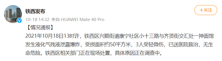 荔枝新闻讯 据沈阳铁西区官方微博消息,2021年10月18日13时许,铁西区兴顺街道康宁社区小十三路与齐贤街交汇处一抻面馆发生液化气残液泄露爆炸,受损面积约50平方米,3人受轻微伤,已送医院救治,无生命危险。铁西区相关部门正在现场处置,具体原因正在调查中。