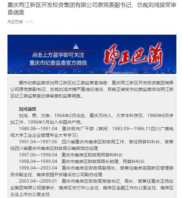 荔枝新闻讯 中共重庆市纪律检查委员会宣传部微信公众号“风正巴渝”消息,据市纪委监委派出两江新区纪工委监察室消息:重庆两江新区开发投资集团有限公司原党委副书记、总裁刘鸿涉嫌严重违纪违法,目前正接受市纪委监委派出两江新区纪工委监察室纪律审查和监察调查。