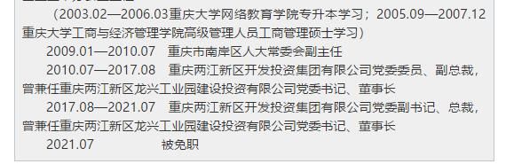 2010.07—2017.08 重庆两江新区开发投资集团有限公司党委委员、副总裁,曾兼任重庆两江新区龙兴工业园建设投资有限公司党委书记、董事长
