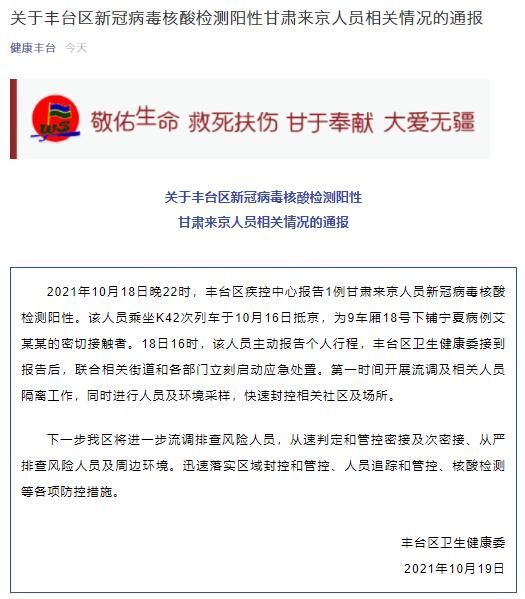 荔枝新闻讯 据健康丰台微信公众号消息,2021年10月18日晚22时,丰台区疾控中心报告1例甘肃来京人员新冠病毒核酸检测阳性。该人员乘坐K42次列车于10月16日抵京,为9车厢18号下铺宁夏病例艾某某的密切接触者。18日16时,该人员主动报告个人行程,丰台区卫生健康委接到报告后,联合相关街道和各部门立刻启动应急处置。第一时间开展流调及相关人员隔离工作,同时进行人员及环境采样,快速封控相关社区及场所。