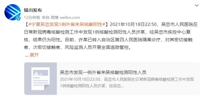 荔枝新闻讯 据银川发布消息,2021年10月18日22:50,吴忠市人民医院在日常新冠病毒核酸检测工作中发现1例核酸检测阳性人员许某,经吴忠市疾控中心复核,结果仍为阳性。