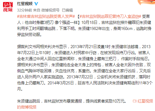 朱贤健逃脱后,吉林监狱发布悬赏通报,提供线索者奖励10万元。