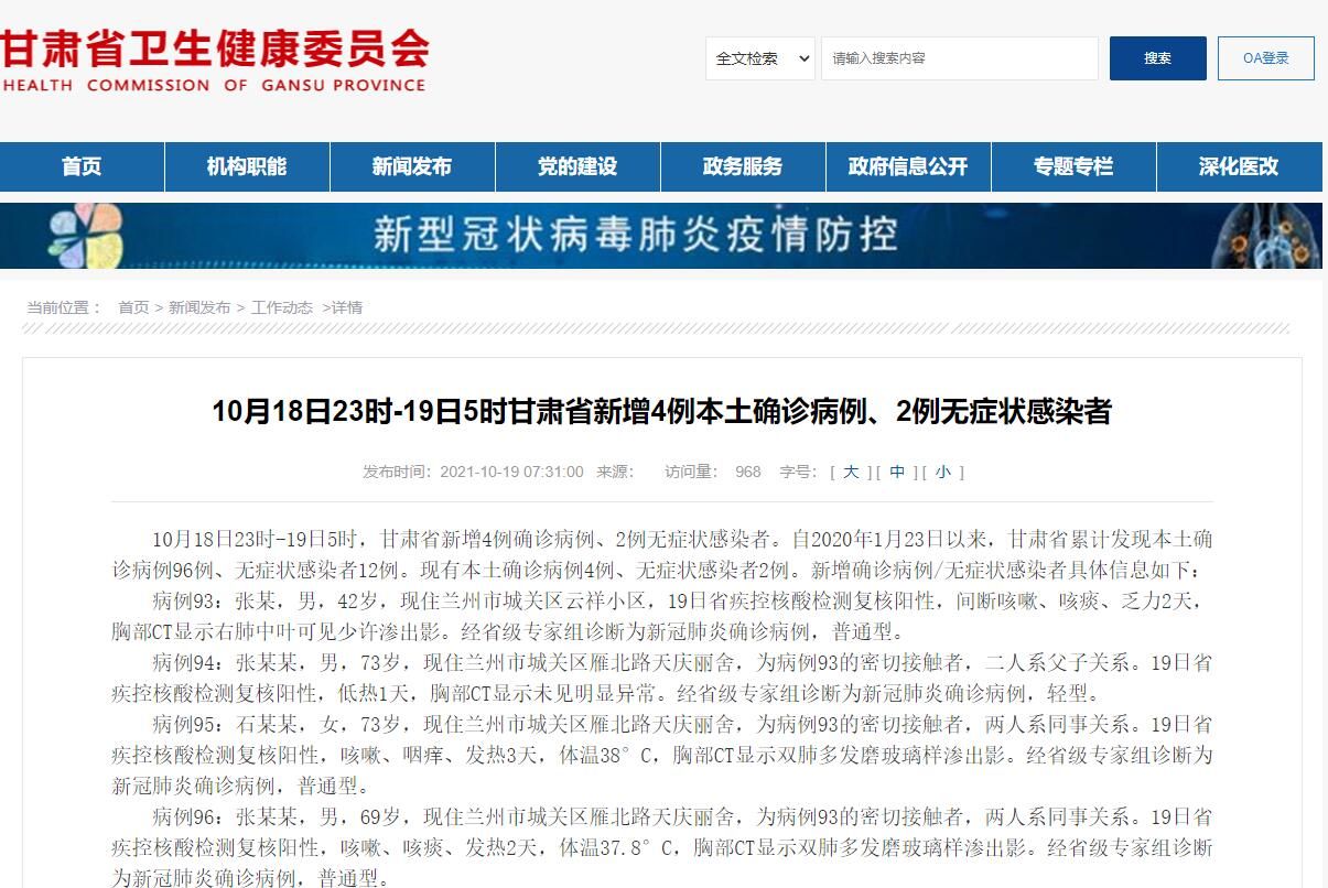 荔枝新闻讯 据甘肃省卫生健康委员会网站公布最新消息,10月18日23时—19日5时,甘肃省新增4例确诊病例、2例无症状感染者。自2020年1月23日以来,甘肃省累计发现本土确诊病例96例、无症状感染者12例。现有本土确诊病例4例、无症状感染者2例。新增确诊病例/无症状感染者具体信息如下: